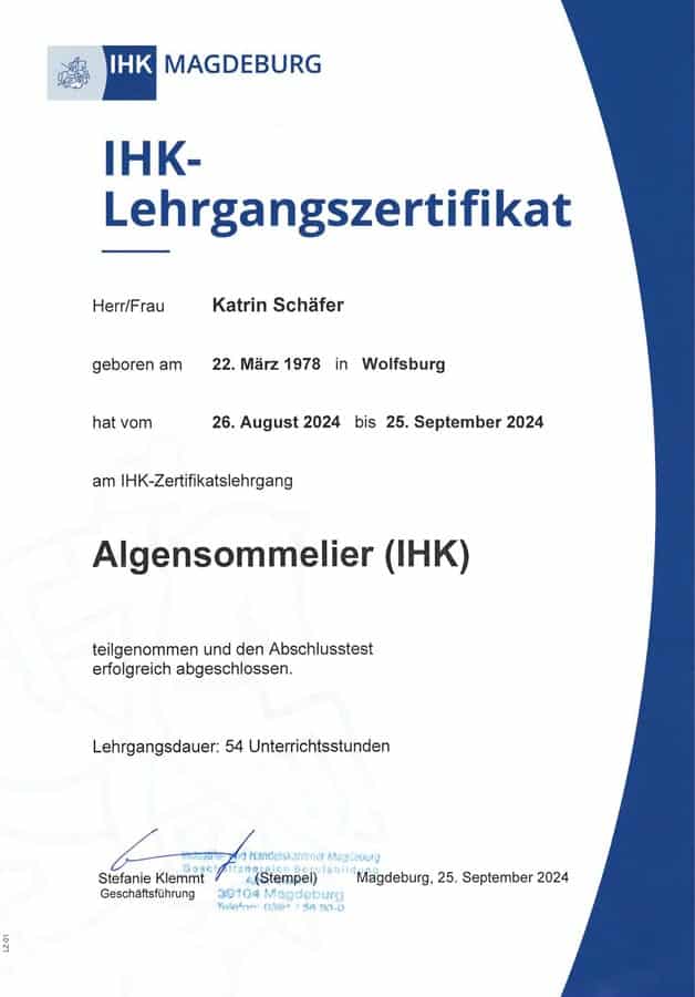Zertifikat Fachfortbildung zur Fastenleiterin – Ernährungswissenschaftlerin und -beraterin Katrin Schäfer